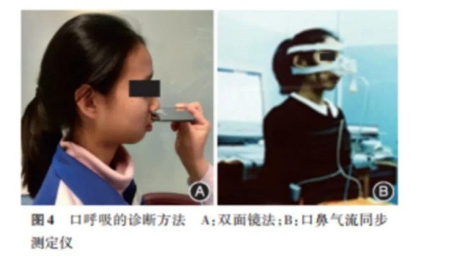 把低于室温的双面镜放在鼻孔和嘴唇之间,观察镜片,上面镜片有雾就是鼻呼吸,下面镜片有雾就是口呼吸。