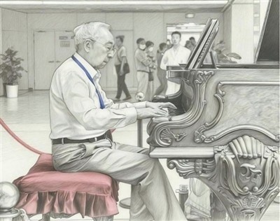 沈学善正在南京鼓楼医院做钢琴志愿服务,AI修饰生成素描画